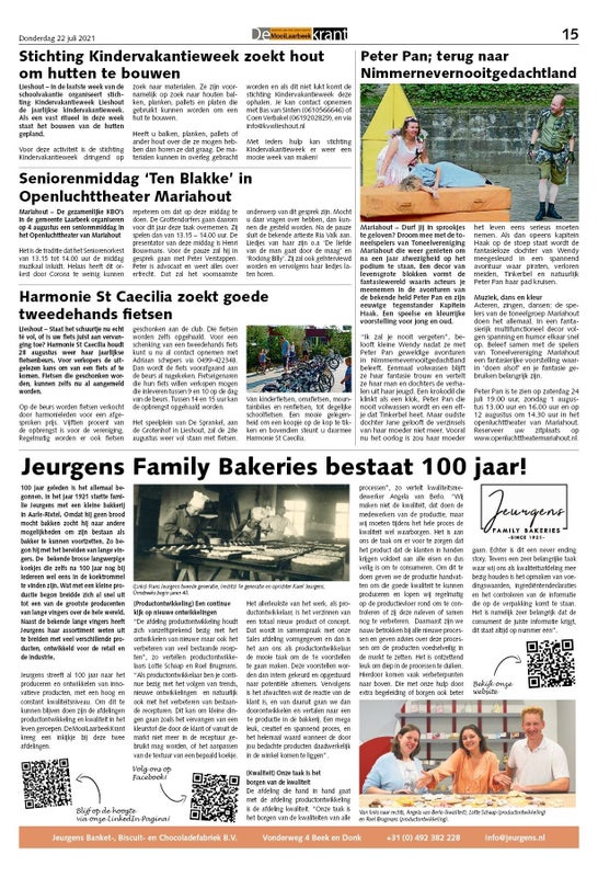 Jeurgens staat in de Mooi Laarbeek Krant! Vanwege haar 100 jarig bestaan wijd de Mooi Laarbeek Krant in totaal 4 artikelen aan de verschillende afdelingen van Jeurgens die het bedrijf draaiende houden. Voor het eerste artikel blikt de Mooi Laarbeek Krant terug naar het begin van Jeurgens in 1921 en nemen zij een kijkje bij de afdelingen productontwikkeling en kwaliteit.